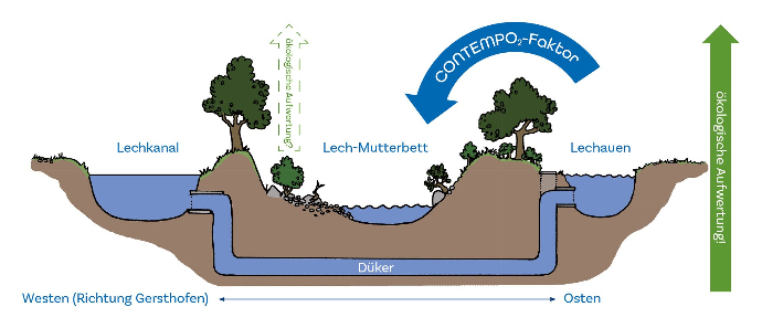Mit dem Projekt CONTEMPO₂ wird entlang des Lechs getestet, wie die Auswirkungen des Klimawandels auf Gewässer mit Ausleitungskraftwerken vermindert werden können. Dabei richtet sich der Blick sowohl auf die Gewässerökologie als auch auf die Lechauen. Durch die gezielte Ausleitung des Lechwassers in die Aue wird das Bachsystem zwischen Gersthofen und Meitingen reaktiviert. Wertvoller Lebensraum für heimische Tier- und Pflanzenarten im und am Wasser wird geschaffen. Es kommt zu einer ökologischen Aufwertung.